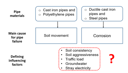 The main cause of failures in ductile cast iron and steel pipes is corrosion. Corrosion-induced pipe failures are influenced by factors such as groundwater, soil aggressiveness, and the presence of power supply cables.