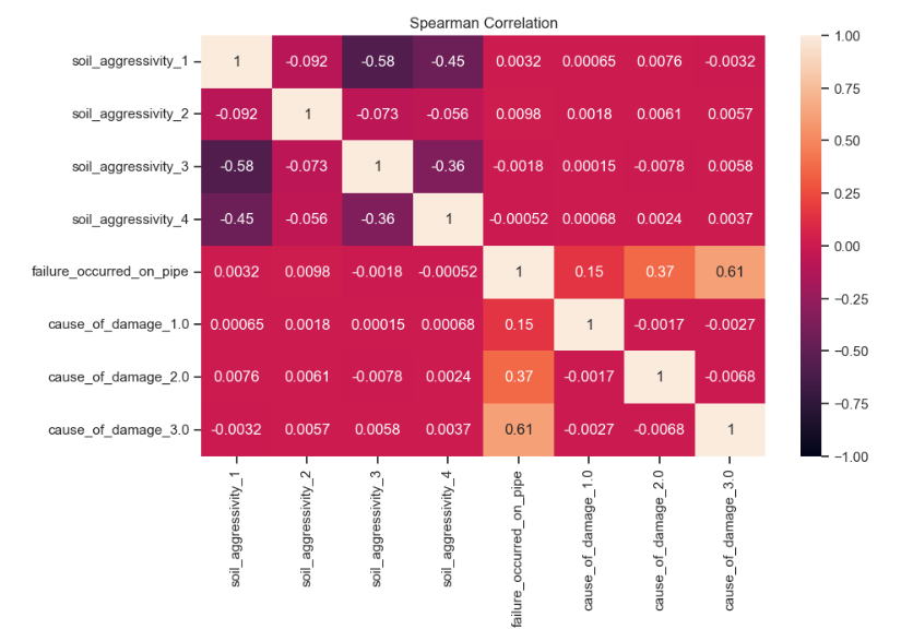 Observation: Lack of strong correlation with failure occurrence. Upon reviewing the correlation matrix, no substantial correlation was observed between the analyzed factors, encompassing both structural and environmental elements, and the incidence of pipe failures. This indicates that the linear relationship between these specific factors and the occurrence of failures may not be statistically significant.