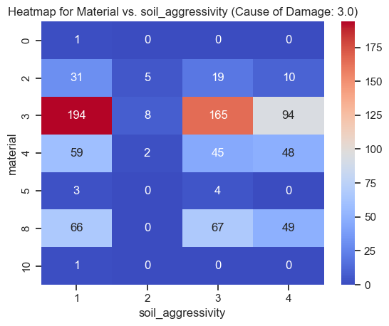 Exploring soil aggressivity influence with correlation matrix and heatmap of occurrence frequency for combination of pipe material and soil aggressivity in 'cause of damage' categories 2 (soil movement) & 3 (corrosion)
