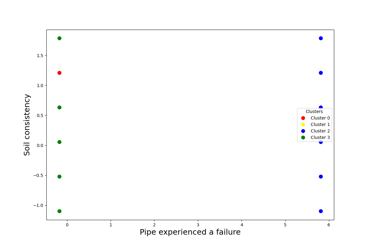2. Analyzing patterns in standardized data clusters for the 'soil consistency' and the binary variable 'failure_occurred_on_pipe'