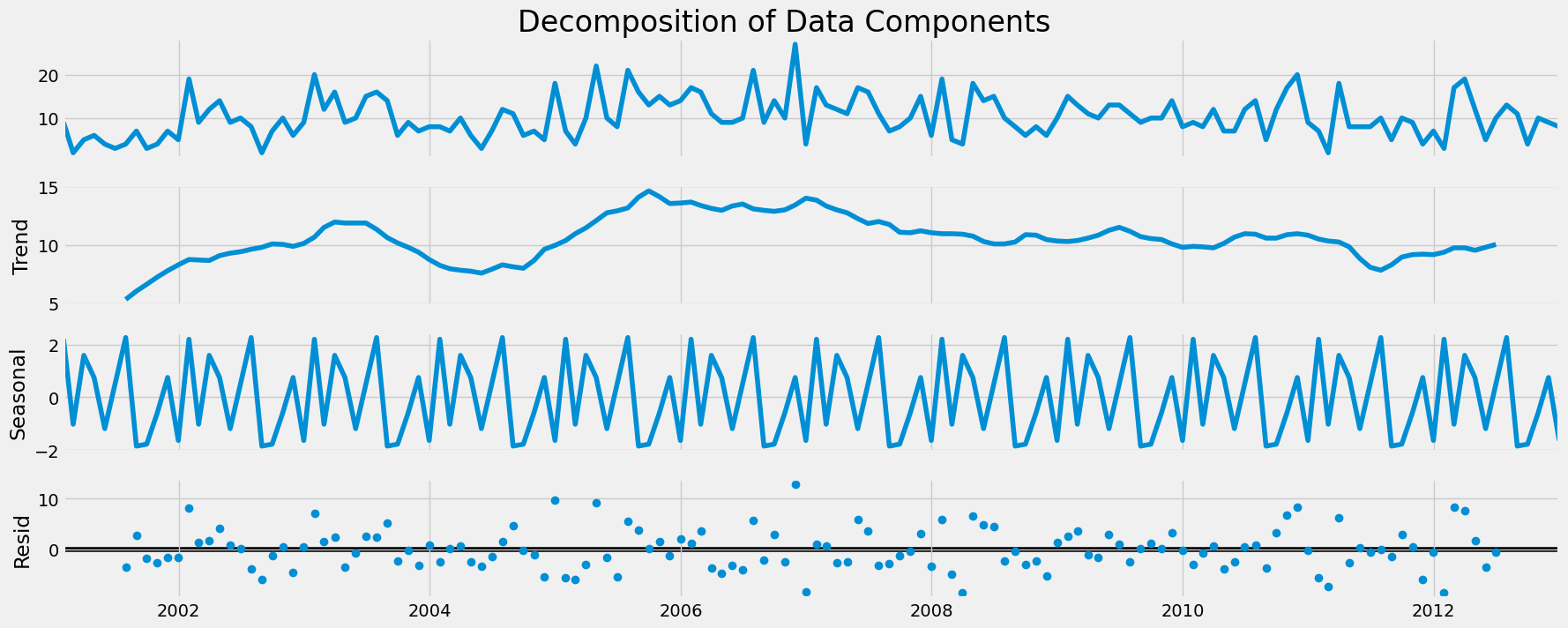 - The fourth component is the noise—or, as it’s called here, “residual.” That is what’s left of the data after the trend and seasonality have been extracted (hence the term residual).