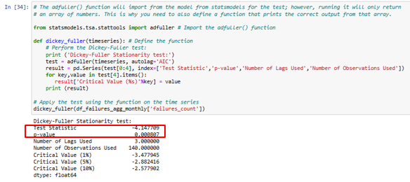 Observation: The test statistic (-4.15) is smaller than the critical value (-3.48), indicating that the null hypothesis can be rejected. This implies that the data is stationary. Additionally, the obtained p-value of 0.00081 (p < 0.05) further supports the rejection of the null hypothesis, confirming the stationarity of the data.