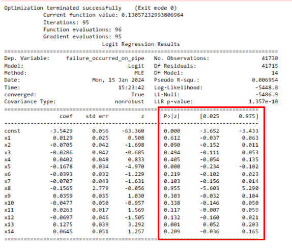 At the outset, binary logistic regression was chosen for the analysis, given that the dependent variable, 'failure_occurred_on_pipe,' is characterized by binary values (0 – no occurrence of pipe failure or 1 – occurrence of pipe failure). Simultaneously, the independent variables exhibit a categorical nature. Logistic regression proves highly effective in scenarios where the outcome is binary.