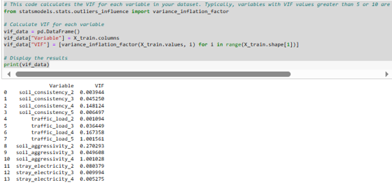 Observation: The calculated Variance Inflation Factor (VIF) values for each independent variable are remarkably low, indicating a minimal presence of multicollinearity among the predictors. Generally, VIF values below 5 or 10 are considered low, signifying that the precision of the estimated coefficients is not substantially influenced by multicollinearity.