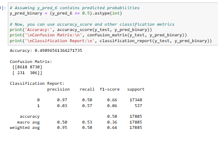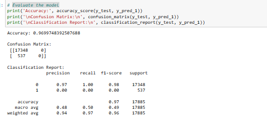 The results show a high accuracy of 96.99%, but the confusion matrix and classification report reveal potential issues with the model's ability to predict the positive class (1).