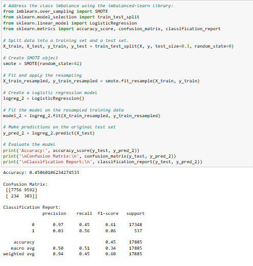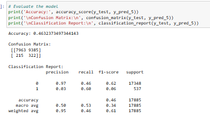 Observation: The accuracy has dropped significantly from 96.99% to 45.06% after applying SMOTE. The precision, recall, and f1-score for class 1 have slightly improved compared to the initial model, but they are still very low.