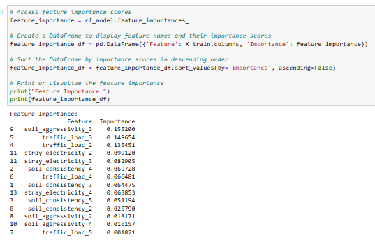 Observation: The scores are normalized and sum up to 1.0, indicating the proportion of importance that each feature contributes to the model. Features with higher importance scores are considered more influential in predicting the target variable, and consequently, features with lower scores are relatively less important in the model's predictions. In this instance, 'soil_aggressivity_3,' 'traffic_load_3,' and 'traffic_load_2' emerge as the most influential features. The identified influential features, such as 'soil_aggressivity_3' (moderately aggressive soil), 'traffic_load_3' (<100 trucks), and 'traffic_load_2' (only passenger cars), may lack clear, direct interpretations in the context of pipe failure.
