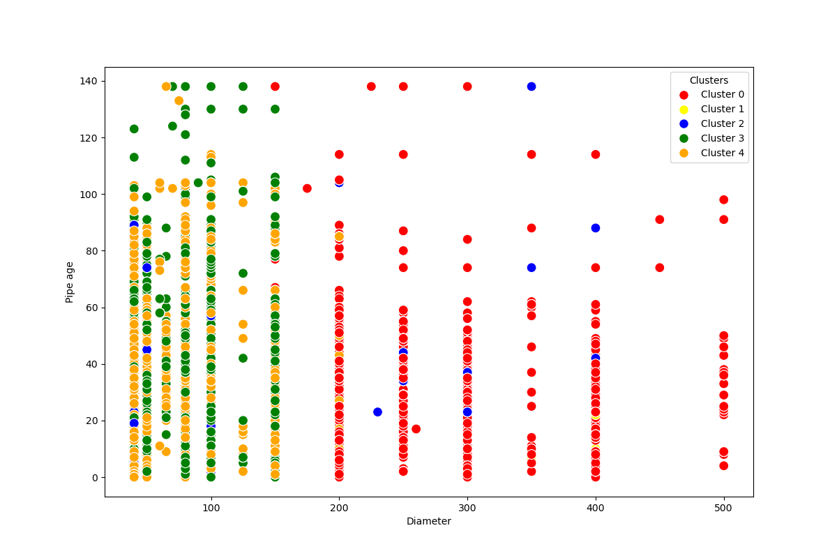Observation: The visualization effectively reveals the distribution of pipe age and diameter across clusters. Clusters 3 and 4 primarily comprise smaller diameters, younger pipes, and middle-aged pipes. Cluster 0 is associated with medium to larger diameters, including both young and middle-aged pipes. Cluster 2 is characterized by older pipes, mostly with smaller to medium diameters. From this analysis of the clusters, we observe that there aren't any discernible patterns, except that the visualizations are logically presented and showcase that the entire range of pipe diameters present over the years.